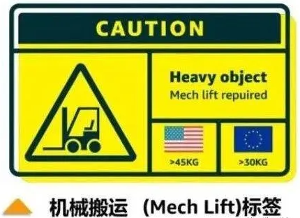 而對于美國站超過45kg的和歐洲站超過30kg的單個貨件,賣家需要張貼的是“Mech Lift”標簽也就是“機械搬運”標簽。