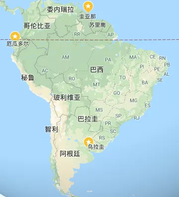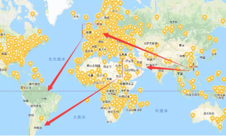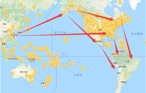 所有從中國去往南美洲,
