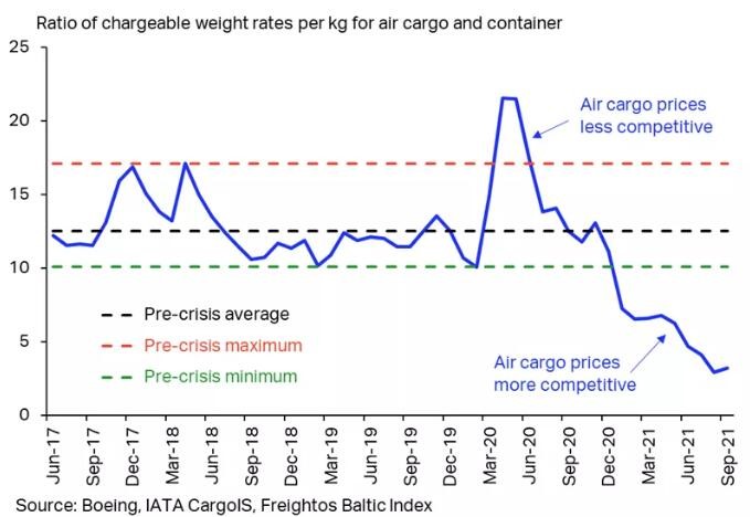 國際航空運(yùn)輸協(xié)會(huì)(International air Transport Association)和業(yè)內(nèi)專家表示,疫情前,空運(yùn)貨物的平均價(jià)格大約是海運(yùn)的13~15倍,但現(xiàn)在只比海運(yùn)貴3~5倍。