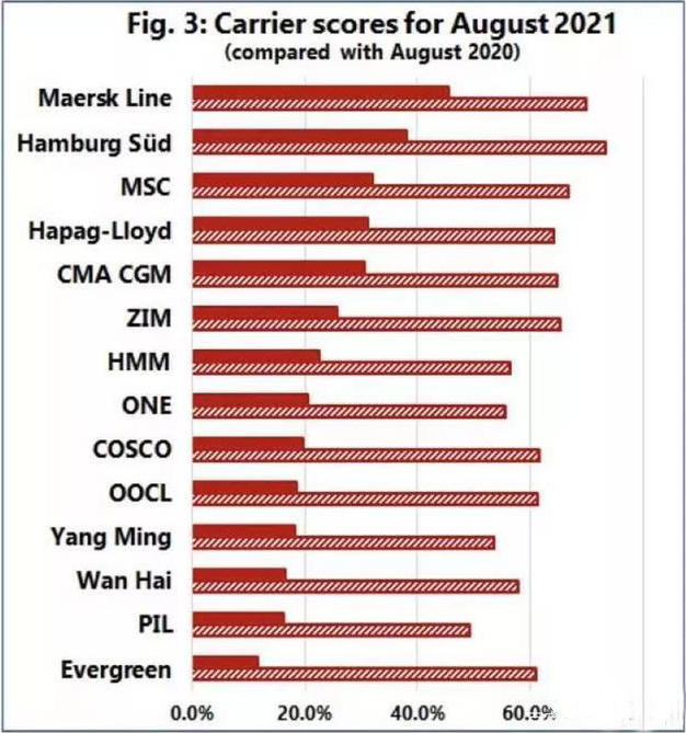 上海航運(yùn)交易所發(fā)布的全球班輪公司準(zhǔn)班率報(bào)告顯示,7月,全球14大班輪公司的準(zhǔn)班率總體漲少跌多。2021年第28周,漢堡南美到港服務(wù)準(zhǔn)班率排名首位,為66.77%,同時(shí)收發(fā)貨服務(wù)準(zhǔn)班率升至第二,為33.33%,地中海航運(yùn)到離港服務(wù)準(zhǔn)班率跌至第二,為21.95%;長(zhǎng)榮海運(yùn)排名末位,僅為6.15%。