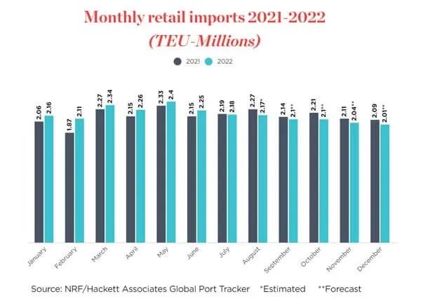 全美零售聯合會(NRF)正在下調其對2022年最后五個月零售進口量的預測,并下調了今年的預測總量。該零售行業協會以持續的通脹和美聯儲將繼續加息的預期為由,預測進口量將出現疫情前以來的首次持續月度下降。