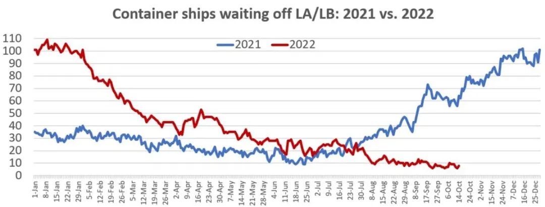 截止上周五(14日),在北美港口外等待的集裝箱船為99艘,與年初相比已有較大改善。
