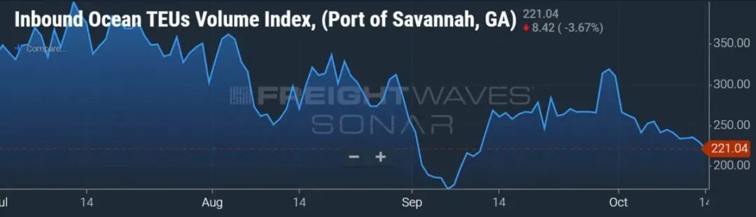 Lynch表示,目前運(yùn)往薩凡納港的集裝箱數(shù)量比7月份的高點(diǎn)下降了22%。FreightWavesSONAR提供的前往薩凡納港的貨物預(yù)訂數(shù)據(jù)也顯示,與7月份相比,貨量出現(xiàn)了類似下降。