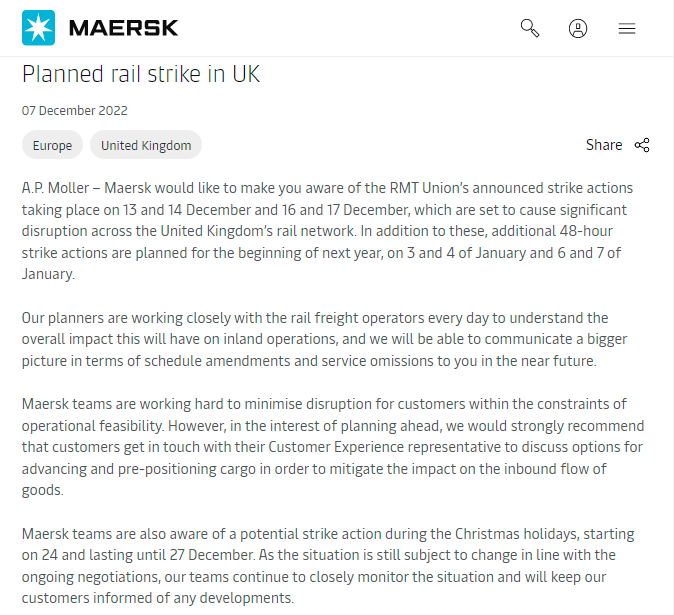 馬士基表示,罷工將導(dǎo)致整個(gè)英國鐵路網(wǎng)的嚴(yán)重中斷,并每天與鐵路貨運(yùn)運(yùn)營商密切合作。