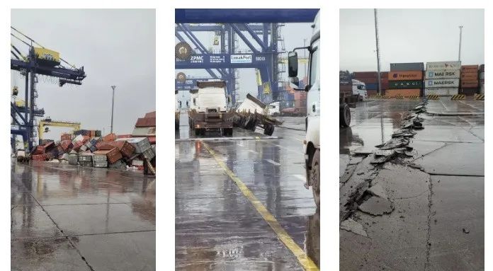 現場照片顯示,地震發生后,伊斯肯德倫港碼頭出現裂縫,數十個集裝箱一個接一個地掉落。許多集裝箱在從高處墜落后嚴重受損,發現貨物散落在堆場上。