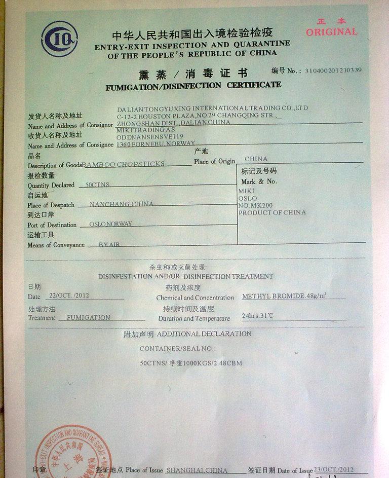 蒸熏證書(shū):
