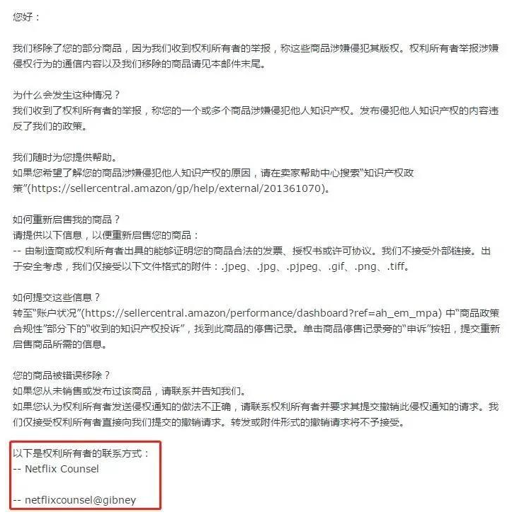 目前版權(quán)的處理上,除Netflix親自下場投訴外,還有平臺的檢測,另外還有一家名為BrandShield的在線威脅追蹤公司,也在進(jìn)行批量檢測并投訴。投訴力度非常大,甚至有賣家表示自己后臺收到的侵權(quán)警告已經(jīng)超過了上百條。