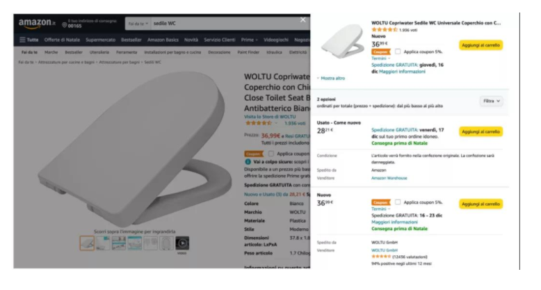 在亞馬遜的一個馬桶座圈產品發現,亞馬遜本身并不直接銷售該產品,買家只能從第三方銷售商那里買到。亞馬遜在購買框中提供了WOLTU GmbH,該商品是由亞馬遜發貨的,因為WOLTU GmbH使用FBA。而且,買家還可以通過亞馬遜Prime享受免費的加急快遞服務。