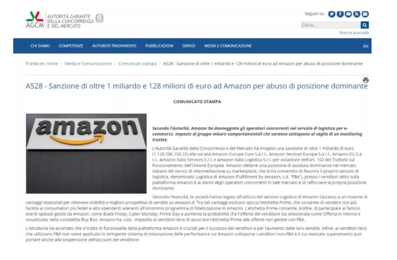 此次事件焦點在于亞馬遜利用其主導地位,偏向其電子商務平臺Amazon.it上使用其FBA(Fulfillment By Amazon)物流的第三方賣家。FBA賣家的商品在2天內就能免費送到Prime會員手中,而FBM賣家的時效完全無法保證,消費體驗上也是欠缺。意大利競爭與市場管理局Autorità della Concorrenza e del Mercato (AGCM)發布的聲明表示,經調查發現,第三方賣家使用FBA和FBM,所受待遇不同,AGCM于12月9日做出11.3億歐元的處罰決定。