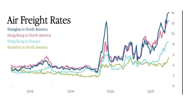 有消息報道稱,上海到北美的航空貨運價格當前以達到了14美元/千克(約89人民幣),創下歷史新高,較8月底的8美元/千克(約51人民幣)上漲了近75%,在疫情初期空運價格是12美元/千克(約76人民幣)。空運帶來的額外費用可能會通過通脹向消費者施加壓力。