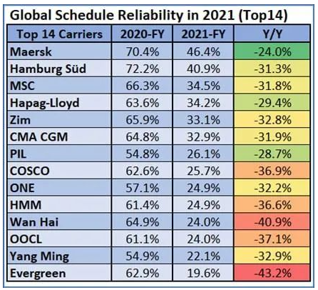 畢竟如今的國(guó)際海運(yùn)準(zhǔn)班率達(dá)到了十年內(nèi)的最低,上海航交所發(fā)布的2022年1月全球主干航線綜合準(zhǔn)班率指數(shù)僅為24.09%;而根據(jù)Sea-Intelligence跟蹤研究的14家船公司的2021年船期準(zhǔn)班率,達(dá)飛以32.9%排名第六位。